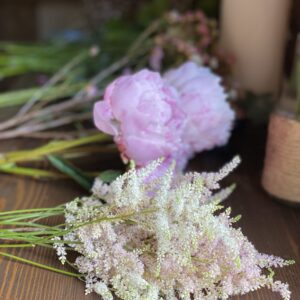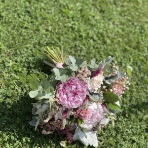 Buchetul de mireasă sau de nașă cu bujori roz este o alegere atunci când vrei să accesorizezi rochia cu ceva wow! Acesta conține o varietate de flori precum lisianthus, trandafir frezie, astilbe, green astrantia  sau wax flower. Este completat de frunze diverse precum eucalipt și dusty miller.
