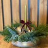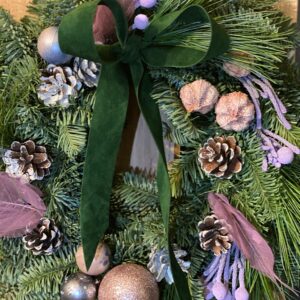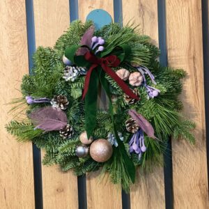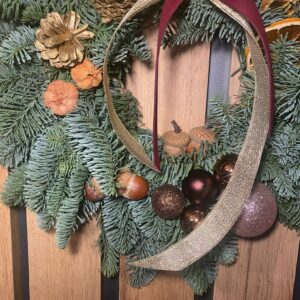 Materiale folosite: crenguțe brad argintiu natural, ramuri pin, flori naturale, globuri, accesorii naturale, panglică