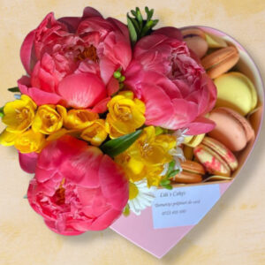Aranjamentul din imagine conține: 3 bujori somon, 5 frezii galbene și 3 margarete; 9 macarons așezate în cutie în formă de inimă.