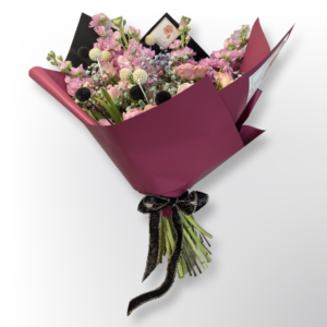 Buchetul conține 7 mathiola, 5 fire trandafir roz, 11 lalele, 14 craspedia, folie, panglică și alte materiale. Este transportat într-un suport cu apă, care îl ajută să se mențină fresh o perioadă îndelungată. Este livrat împreună cu hrană specială pentru flori.